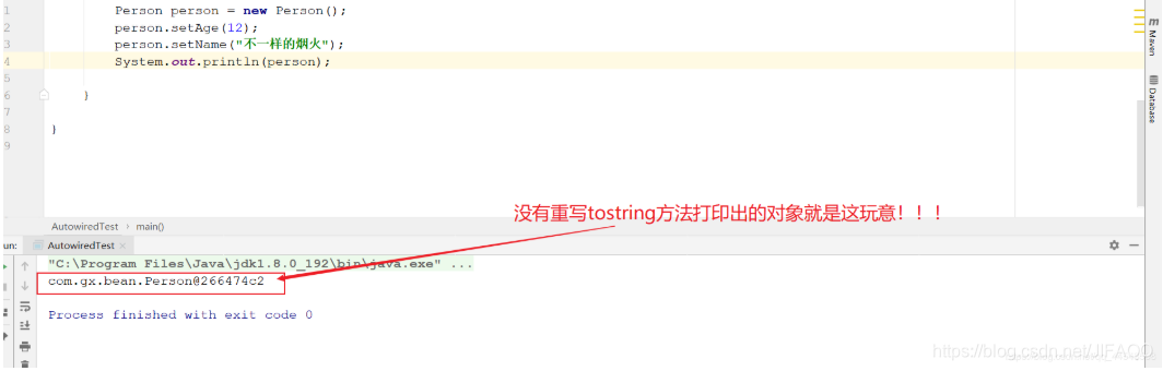 object类里的toString只是把字符串的直接打印,数字的要转化成字符再打印,而对象,则直接打印该对象的hash码(类似@15db9742 这样的东东),它的值大概就是等于getClass().getName()+’@’+Integer.toHexString(hashCode()) ,我这乔治脑袋看着都晕,hash码 这玩意是给机器看的,平凡的人类是看不懂的鸭,什么?你要挑战?你相信你就是不一样的烟火?那行,我就举个例子给你看看,你可以试着在一个实体类中…啥?你要我自己来?额…行,我来就我来….